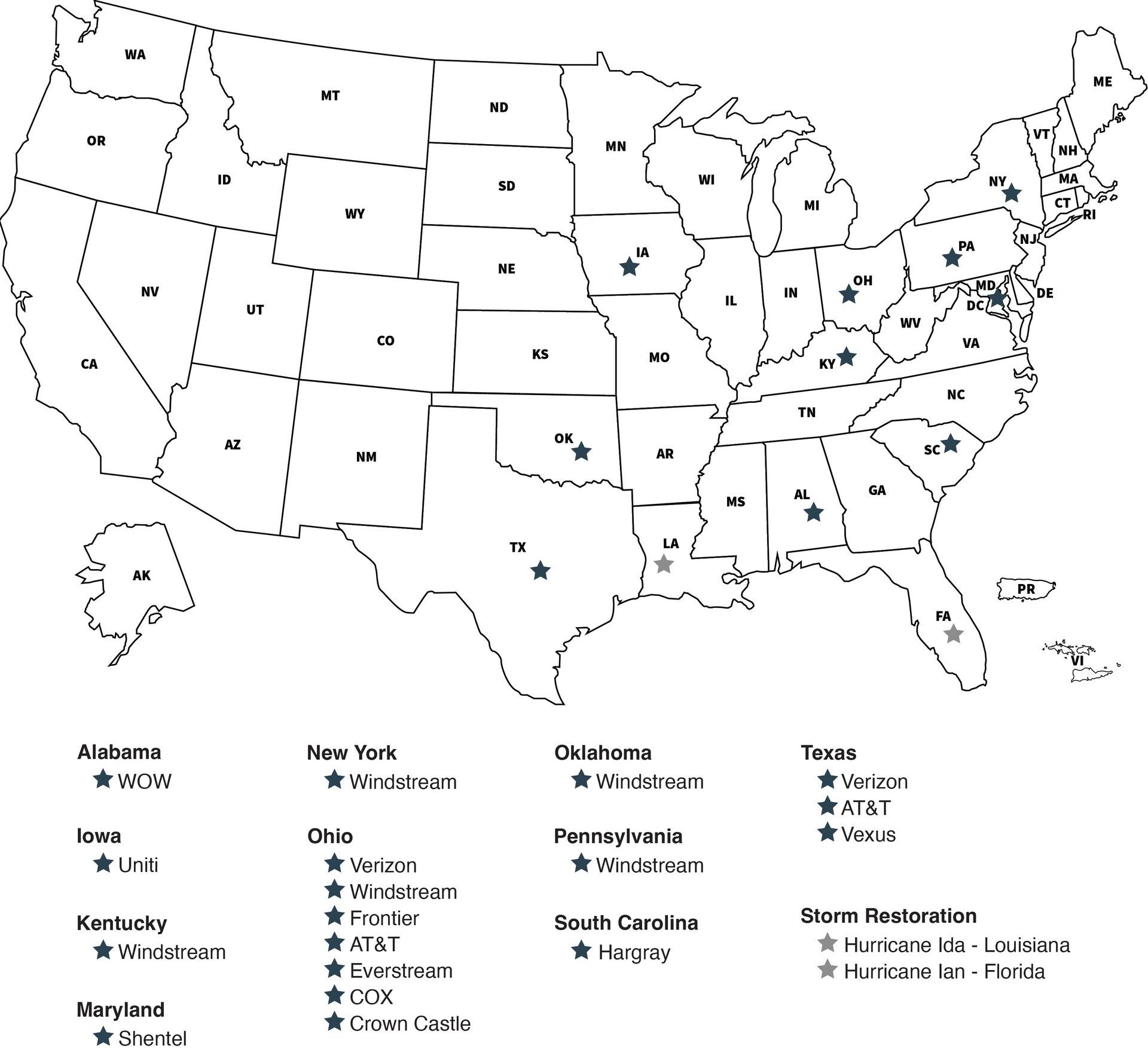 Solutions for all your telecommunications and cable construction needs within the United States. We have a team of experienced professionals who have the expertise to handle all your telecommunication and cable construction needs. From installation and maintenance to storm recovery and repair, we have the expertise to get the job done right.